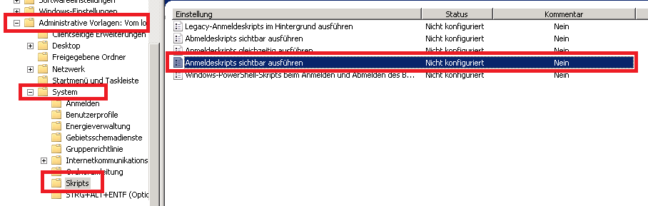 Lösung: Interessanterweise scheint dieser Fehler nicht auf allen Systemen (Trotz gleichem Patchstand, gleicher Windows Edition und Plattform) reproduzierbar zu sein. Da ein Zugriffsproblem wegen des einwandfreien manuellen Aufrufens nicht vorliegt, führt man zu Diagnosezwecken das Logonskript sichtbar aus. Dies kann man durch Aktivieren der Richtlinie "Anmeldeskripts sichtbar ausführen" im Benutzerkonfigurationsteil des Gruppenrichtlinienobjekts. Dazu platziert man den Befehl pause an einigen Stellen des Batch-Skriptes.